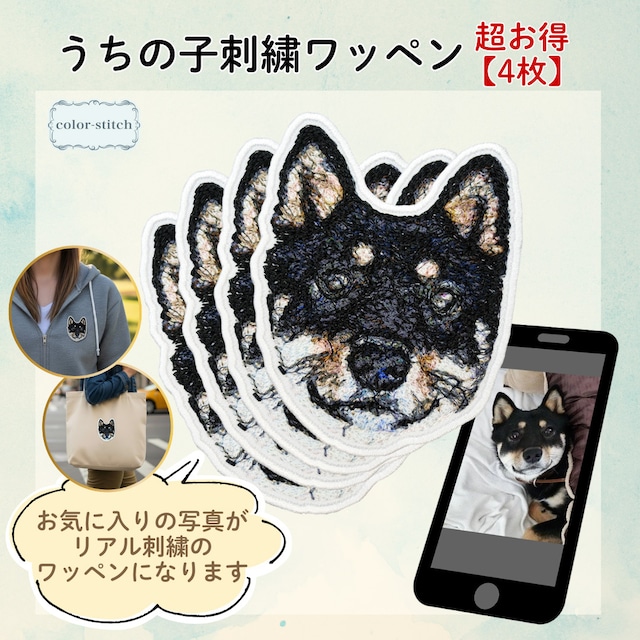 【リアル刺繍ワッペン】オーダーメイド 写真から作るうちの子ワッペン \超お得4枚セット/