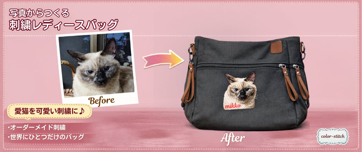 『うちの子と、ずっと一緒にいたい』 そんな想いをカタチにする、 世界にひとつだけのオーダーメイド・うちの子刺繍バッグです。 ✨ 大切なうちの子の写真そのままにリアルな刺繍 ✨ 毛並みや表情・その子らしい雰囲気を再現 ✨ 一点一点に心を込めた高精度刺繍 ✨ お名前・文字入れ無料 ✨ 刺繍精度【ファイン】選択でワッペンプレゼント ■ ギフト・メモリアルにもおすすめ ✔ ギフト:お誕生日や記念日の贈り物に ✔ ペットロス:ずっとそばに感じていたい ✔ オーダーメイド:世界にひとつだけ ✔ オリジナルラッピング袋付き ■ 刺繍精度(刺繍サイズ:10cm以内) 【ノーマル】 一般的な精度の写真刺繍です。 やや荒さを感じる場合がありますが、それも刺繍ならではの味わいです。 濃色バッグでは生地色が透けて見えることがあります。 【ファイン】 当店自慢の高精度刺繍。 目・鼻・口など細部まで、写真に近い再現が可能です。 【ファインカスタム】(2匹対応) 2匹刺繍の場合、1匹あたりのサイズが小さくなるため 再現精度はやや控えめになります。(1匹 約5cm前後) ※ 刺繍糸のみで表現するため、写真と完全に同一にはなりません ※ 写真によってはモノトーン表現の再現性がやや下がる場合があります ■ 刺繍は、あなたとその子の物語から生まれます。 「なぜ刺繍に残したいと思ったのか」 刺繍に決めた想いを大切にしながら制作しています。 ・一緒に過ごしている大切な家族 ・虹の橋を渡ったあの子への想い ・贈る方への気持ち あなたの想いが、よりその子らしい刺繍作りにつながります。 一言だけでも備考欄や質問欄にお聞かせください。 ※任意です。未記入でも問題ございません。 ■ 発送までの流れ (1) ご購入後、写真を送信【必須】 → 当店メール:[email protected] → または、担当からの案内メールに写真を添付してご返信ください※1 (2) 刺繍構図(デザイン)のご確認【必須】 〈写真受領後、1週間前後〉 (3) 刺繍イメージの確認【任意】 〈ご希望の場合のみ対応〉 (4) 刺繍制作 ※2※3 約8週間(2匹の場合は約10週間) (5) 完成次第、発送 ※1 迷惑メール設定をご確認ください ※2 2匹刺繍の場合は制作期間が延びます ※3 年末年始・GWは前後する場合があります 【Instagram】 オーダー作品や制作風景を紹介しています。 https://www.instagram.com/color_stitch_jp/ 【掲載許可】 作製過程の撮影や配信/紹介をしてもよろしいでしょうか? ご了承をいただいた場合は、粗品をプレゼントさせていただきます。 ・OK/掲載を了承いたします ・NG/掲載を許可しない ■ バッグについて キャンバス生地で便利なポケットが7つ、ファスナー付き。 裏地はストライプ模様でおしゃれなレディースバッグ。 ・サイズ:約 高さ30cm/口幅44cm/マチ33×13cm ・素材:キャンパス、ポリエステル ・ポケット:フロント1、背面1、サイド2、内3(ファスナー1) ・色:ベージュ/エンジ/グレー/ブラック ■ オプション ご注文に至ったお気持ちなど備考欄にご記入ください。 ※こちらは任意項目です。 【ネーム】 8文字以内/アルファベット or 数字 【書体・色】(選択なし:筆記体・黒) 書体:筆記体・丸ゴシック体 色:黒・白・ゴールド・ベージュ・ネイビー・カーキ・ピンク ■ 注意事項 ※顔のみの刺繍となります(全身不可) ※できるだけ明るく、解像度の高い写真をご用意ください ※写真の画質により仕上がりに差が出ます ※刺繍イメージは画像データのため、実際の刺繍とは若干の差異があります ※フォト刺繍(うちの子刺繍/リアル刺繍)は高品質の刺繍技法ですが、写真と完全に同一にはなりません ・著作権・商標のあるキャラクターは刺繍できません ・ご不明点はご注文前にお気軽にお問い合わせください ・モニター環境により色味が異なって見える場合があります ●【Q&A】うちの子刺繍について https//colorstitch.base.shop/blog/2026/02/06/204235 ●うちの子刺繍のご注文方法 https://colorstitch.base.shop/blog/2026/02/06/204901 ●上手な写真の選び方 https://colorstitch.base.shop/blog/2022/12/13/154431 ーーーーーーーーーーーーーーーーーーーーーー 【color-stitch/b501】