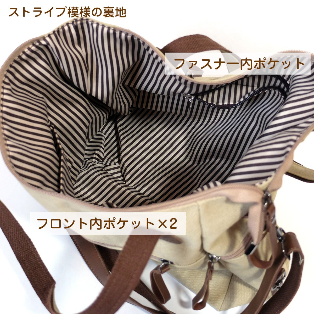 キャンバス生地で便利なポケットが7つ、ファスナー付き。