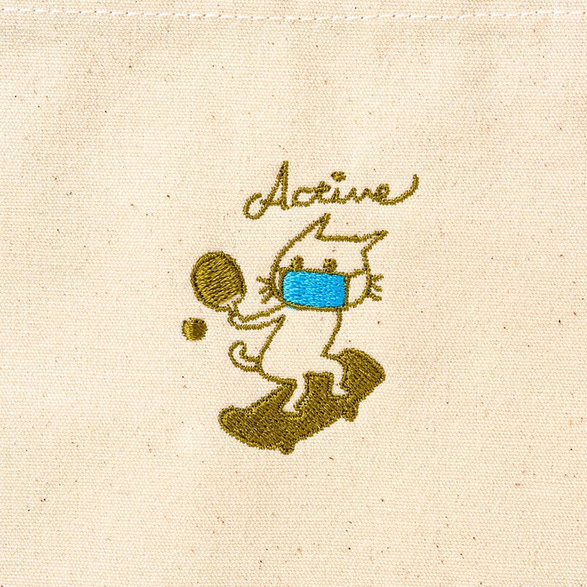 卓球とスケボーをしているアクティブなネコの刺繍入りトートバッグ。
