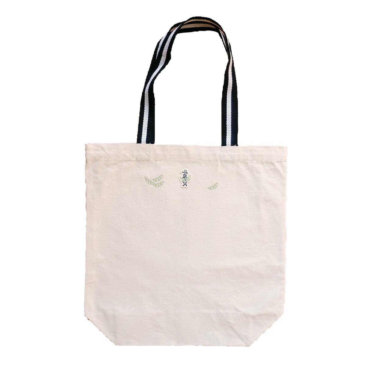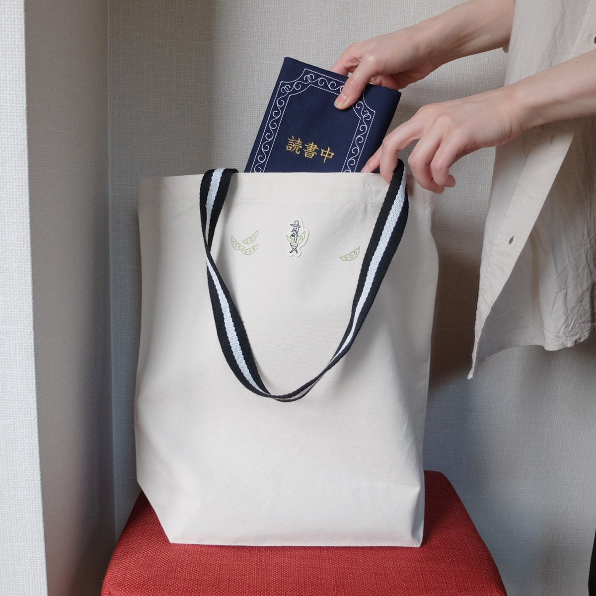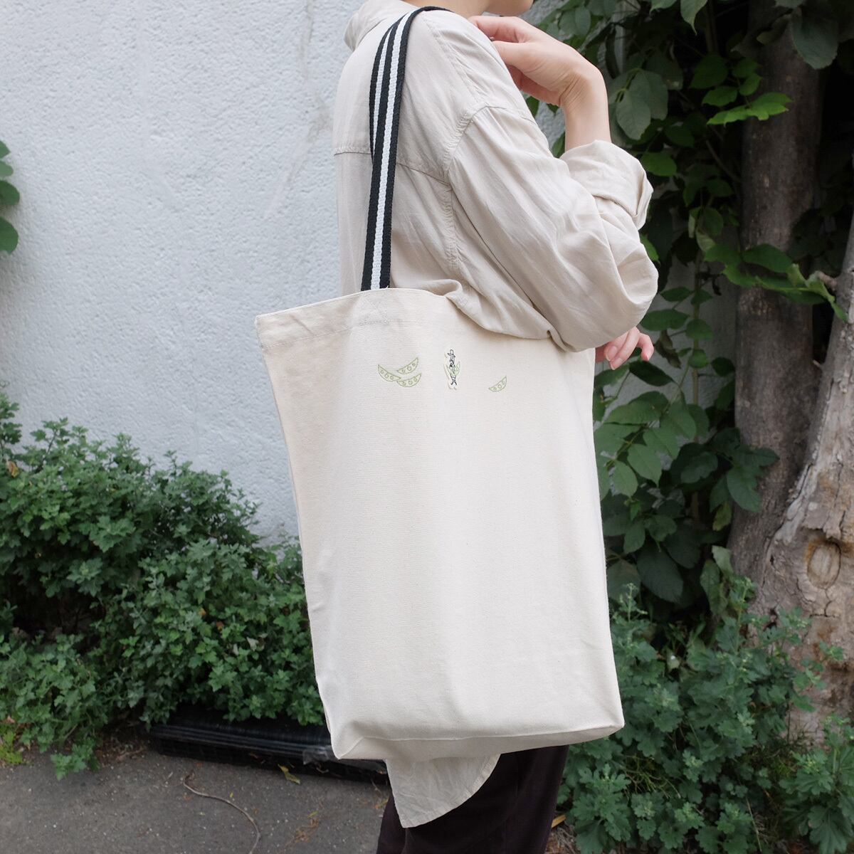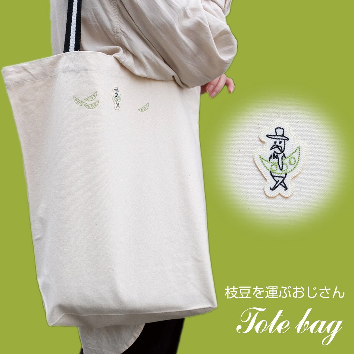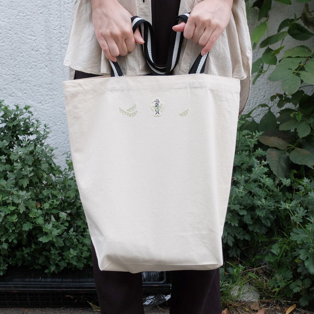 枝豆を運ぶおじさんの刺繍入りトートバッグ。