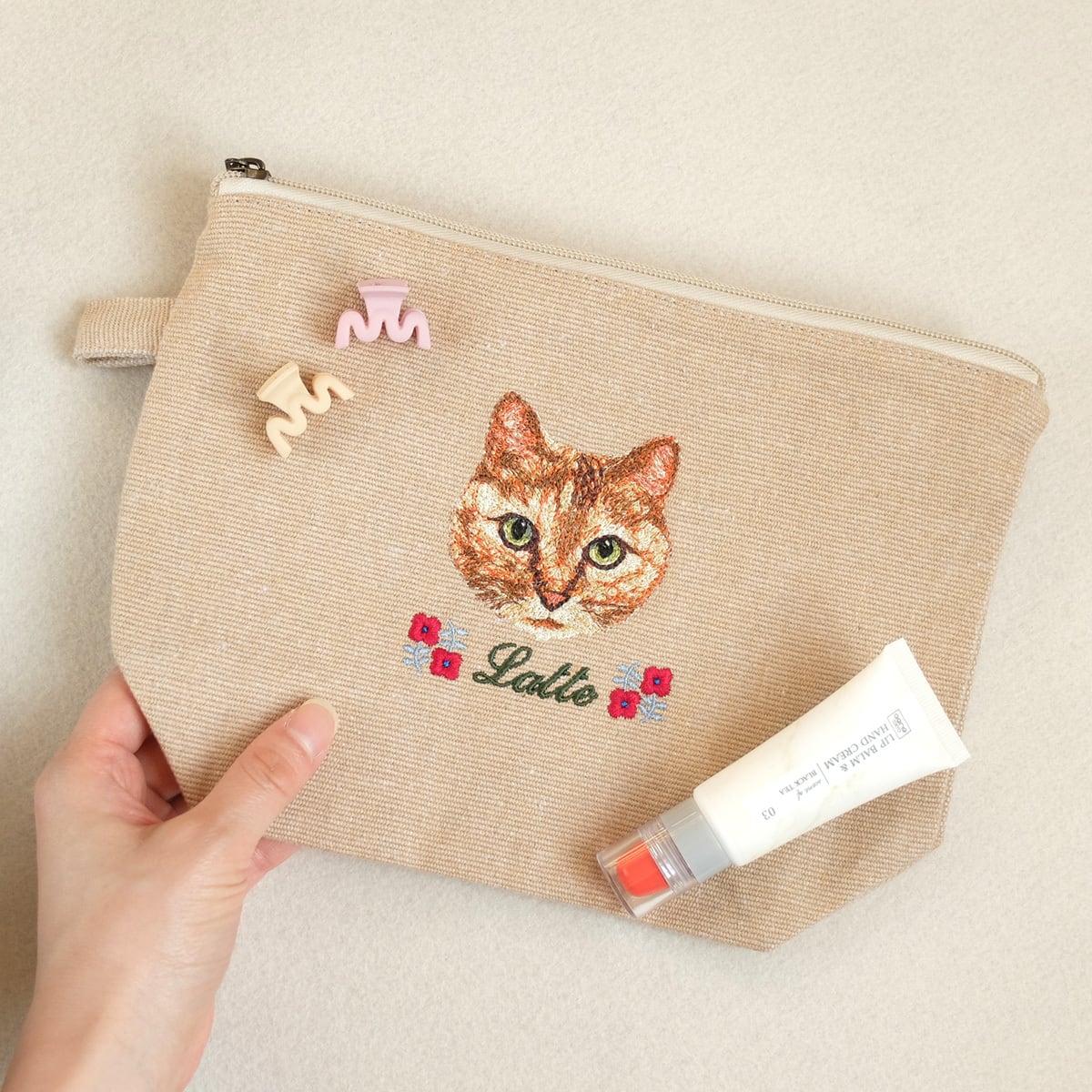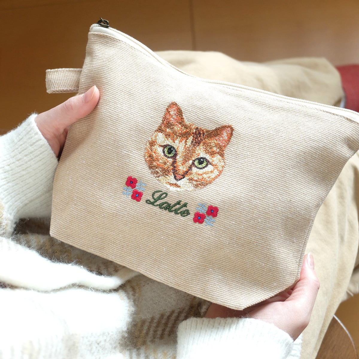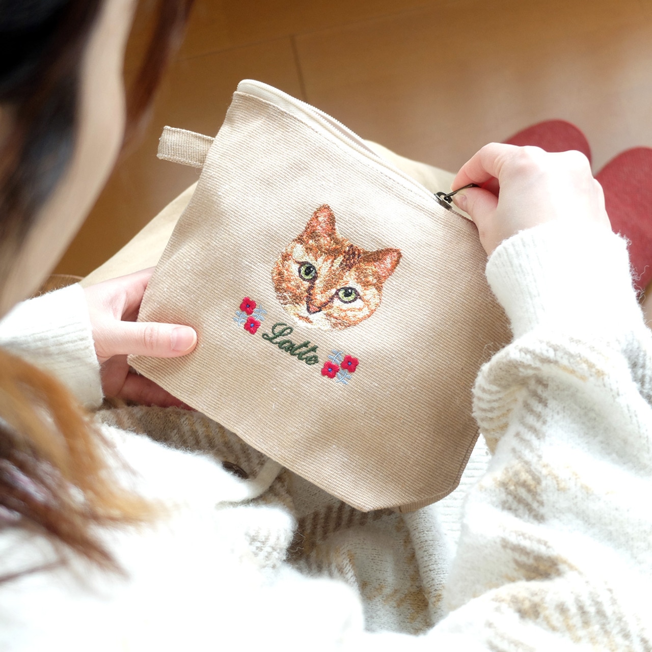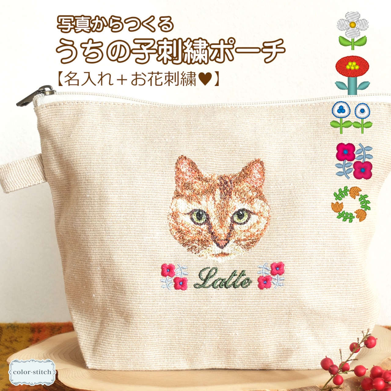 \ワッペンpresent/ ペット写真からつくるリアル刺繍|うちの子ポーチ|花飾り+名入れ|ギフト対応|オーダーメイド